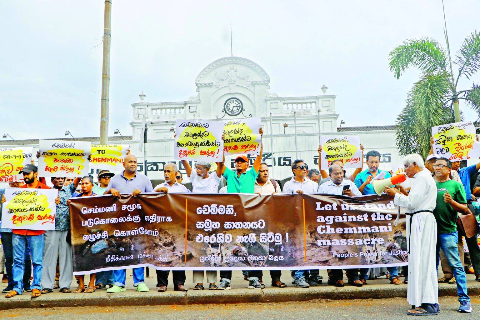 A protest calling for justice and accountability for mass graves across Sri Lanka—including the recently spotlighted Chemmani site—was held yesterday in front of the Fort Railway Station in Colombo, yesterday (17).