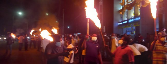 Activists of the Samagi Jana Balawegaya in Panadura staged a torchlight procession in front of the Walana Buddha statue in Panadura against fuel and commodity prices on Friday (24).