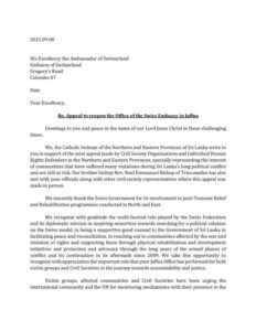 மூடப்பட்ட யாழ். சுவிட்சர்லாந்து தூதரக அலுவலகத்தை மீண்டும் திறக்கவும் –  வடக்கு-கிழக்கு ஆயர் மன்றம்