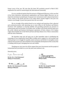 யுத்தம் முடிவுக்கு வந்து பன்னிரண்டு ஆண்டுகள் நிறைவுற்றபோதும் பல்வேறு நெருக்கடிகளுக்கு முகம் கொடுக்க வேண்டியுள்ள வடக்கு-கிழக்கு பிரதேசத்தில் சர்வதேச நிறுவனங்கள்,மனித உரிமை கண்காணிப்பாளர்கள்,இராஜதந்திர அதிகாரிகளின் பிரசன்னம் மிகவும் அவசியமாக இருக்கின்ற இச்சந்தர்ப்பத்தில் சுவிட்சர்லாந்து தூதரகத்தினுடைய அலுவலகத்தின் பிரசன்னம் மிகவும் முக்கியமானது என்பதை ஆயர் மன்றம் குறித்த கடிதத்தில் சுட்டிக் காட்டியுள்ளது.